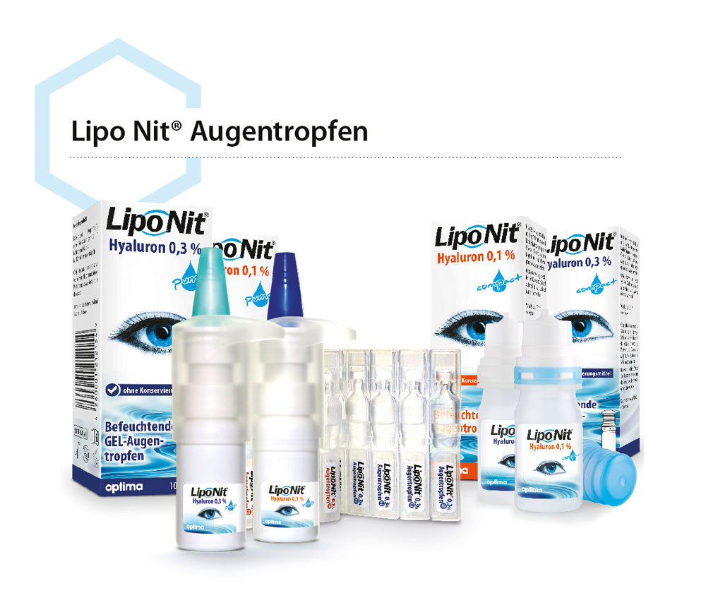 LipoNit® Augentropfen gibt es in zwei Varianten. Hyaluron 0,1% bei leichten bis mittlere Beschwerden und Hyaluron 0,3% bei starken Beschwerden.
